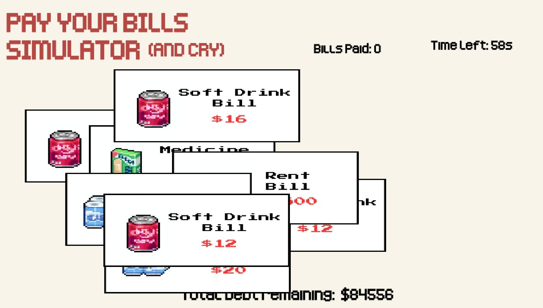 Life comes at you fast—and so do the bills! Click, panic, and try to pay off as many bills as possible before your time runs out.